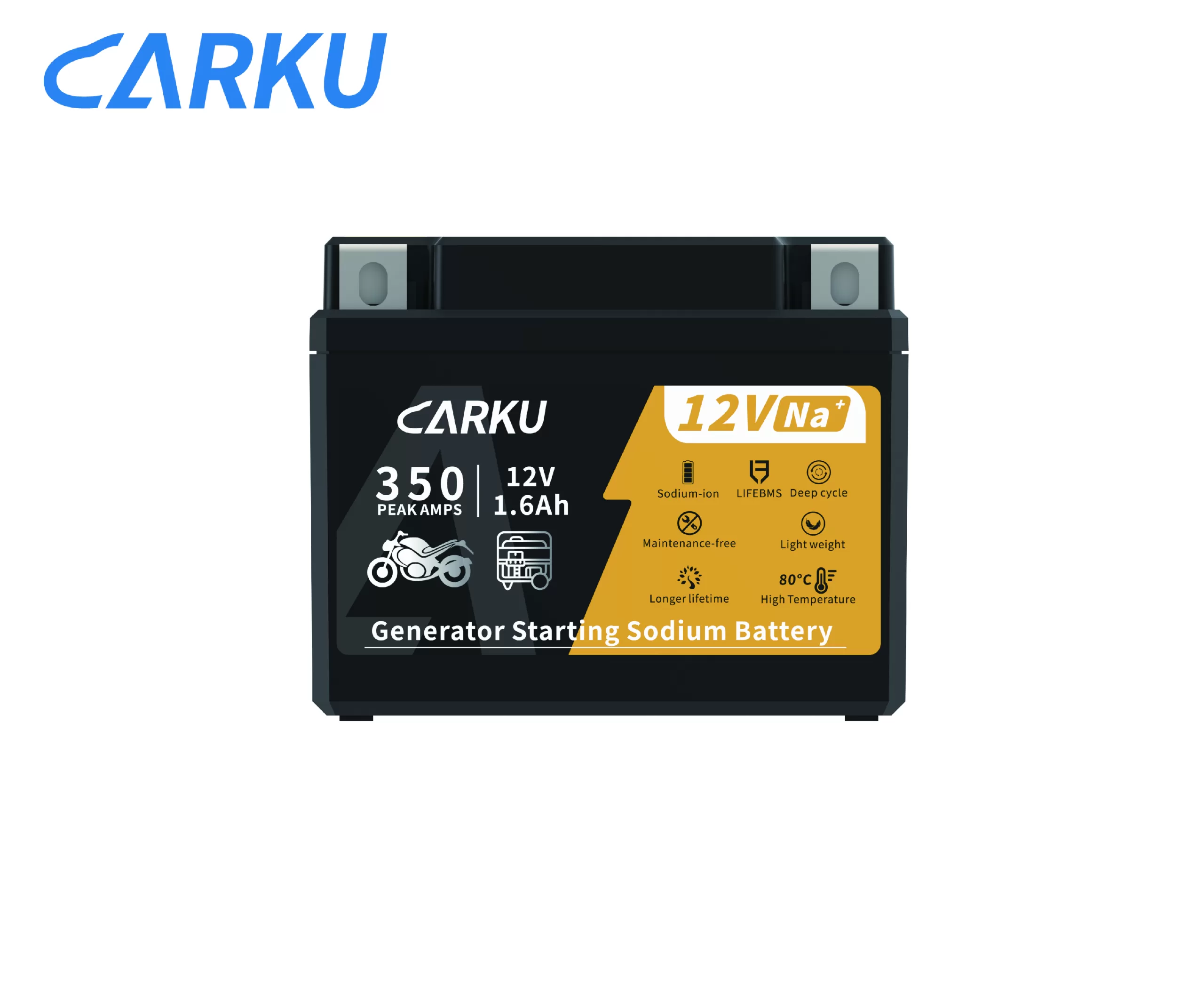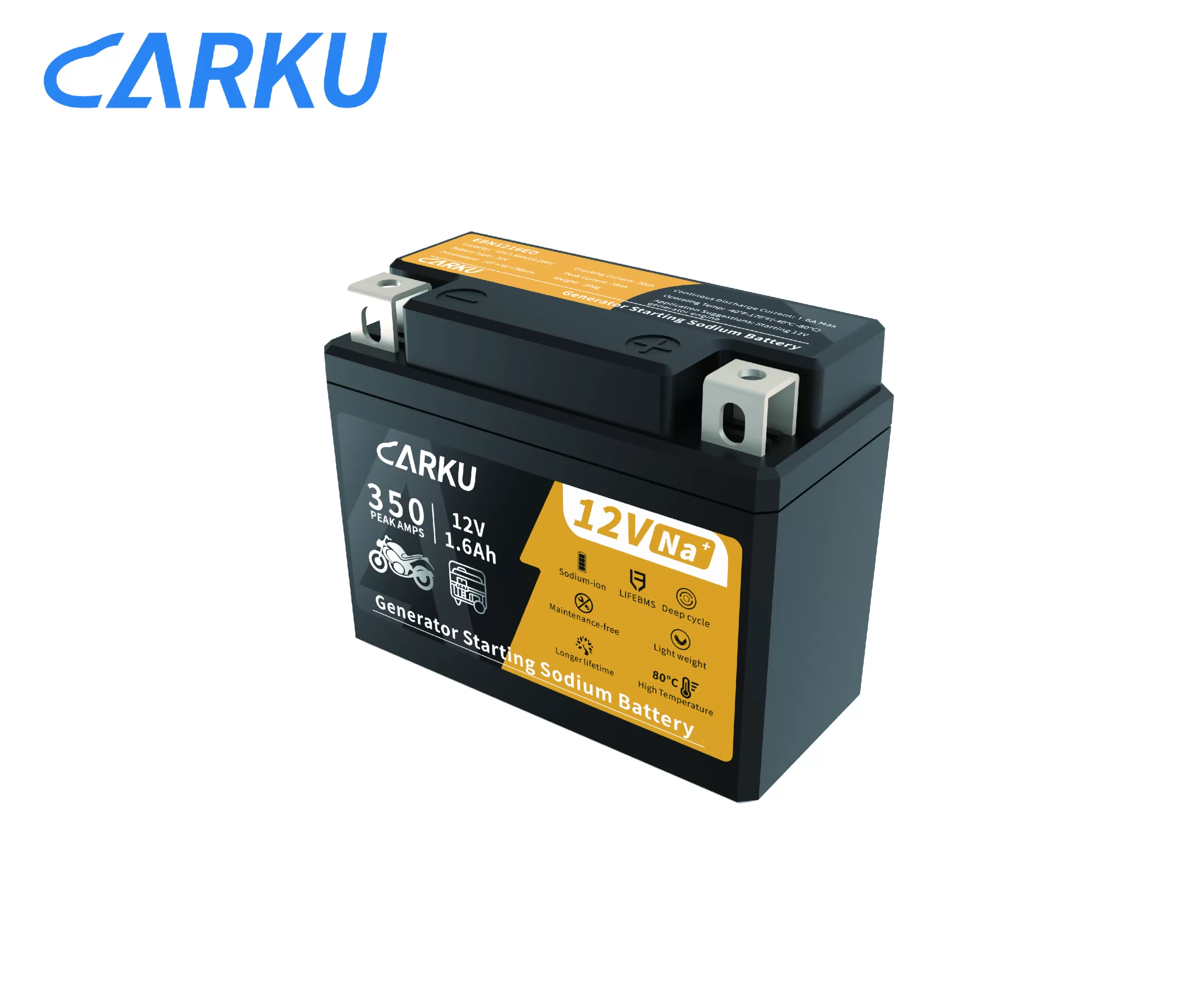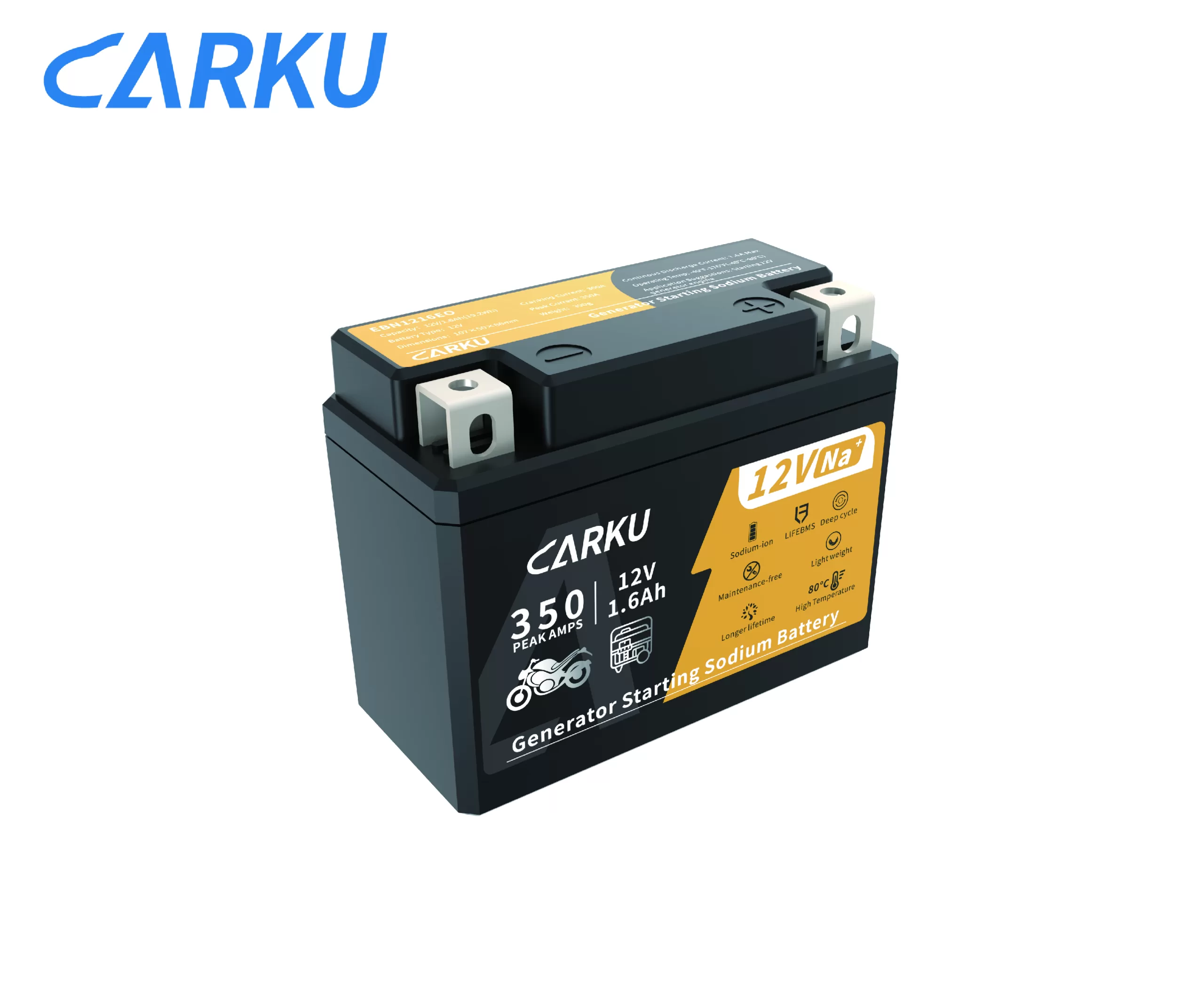 The EBN1216EO combines long-lasting sodium-ion performance with a built-in BMS for reliable generator starts. Its Na⁺ chemistry delivers strong cranking power with up to 350A for instant ignition, even in harsh environments. The battery operates confidently from –40°C to 80°C, while its IP65-rated protection ensures safer, cleaner, and more dependable starts every time.